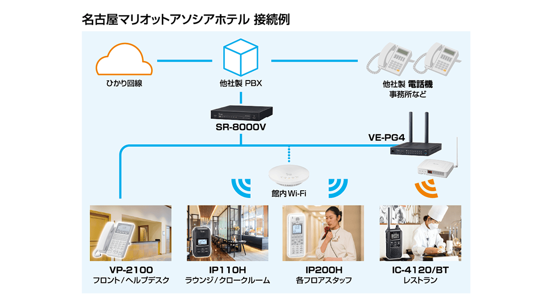 他社製PBXシステムと連携し、ホテル全域にわたる音声通信網を構築。